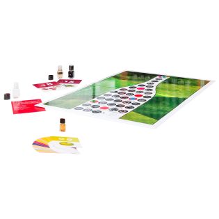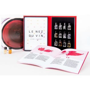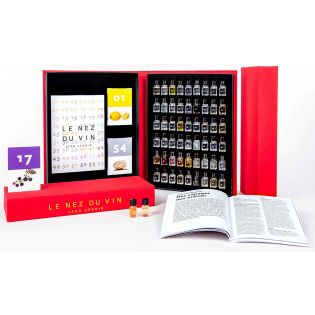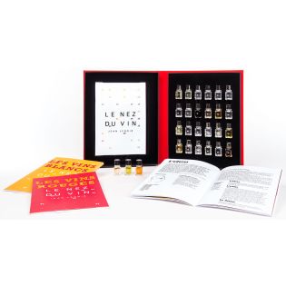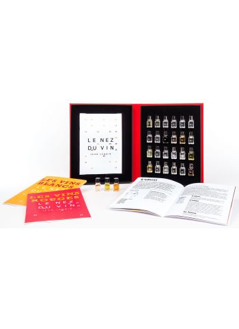 - 24 arômes fondamentaux des vins blancs (dont les champagnes) et des vins rouges, extraits de la collection du grand modèle 54 arômes :